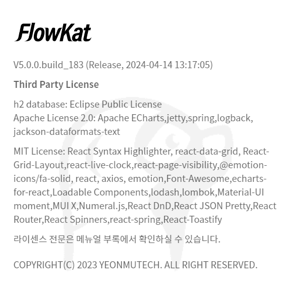 플로우캣의 전반적인 운영 정보와 라이선스, 도움말 등이 배치되어 있습니다.